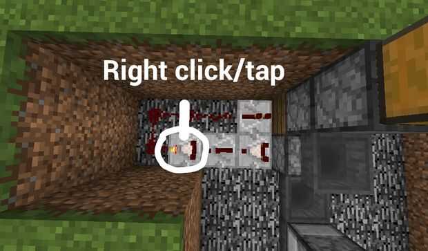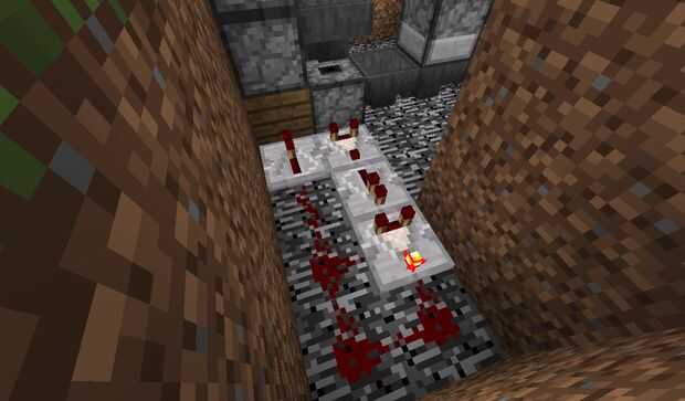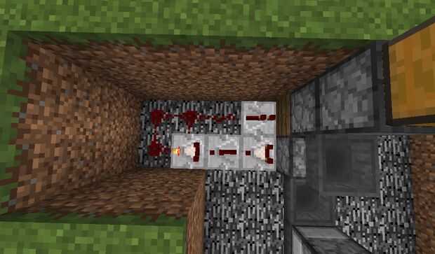 Ahora para la parte más difícil. Primero extienda su agujero un poco, uso la imagen para ayudar. Colocar un comparador hacia fuera desde el gotero de la parte inferior. Colocar un repetidor en el frente, coloque otro comparador delante el repetidor, pero haga clic en el grifo de éste para hacer la antorcha frontal poco encender. Poner polvo redstone frente a esta comparación, al lado de él, diagonal y al lado del repetidor. Una vez hecho esto, coloque otro repetidor en el bloque por debajo de los goteros. Esto es realmente difícil de explicar, así que por favor mire las fotos para ayudar.