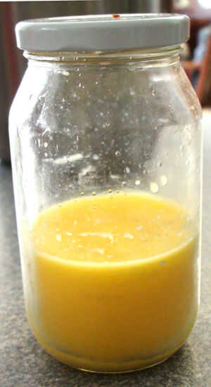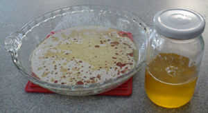 No vierta alguno de los grumos blancos (sólidos de leche) en la jarra. Si, punta el Ghee vuelve a salir y poner en el horno hasta que los sólidos de leche y mantequilla de búfalo se han separado y vuelva a intentarlo. Tirar los sólidos de la leche y la izquierda con mantequilla de búfalo!