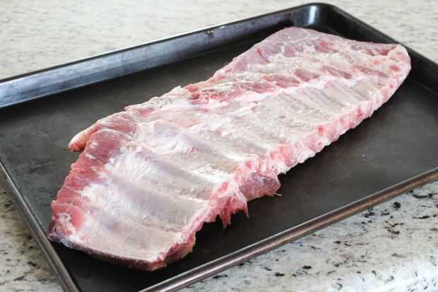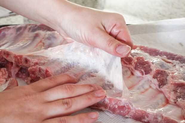 Ahora, voltee las costillas y echar un vistazo. ¿Hay una membrana plateada en la parte posterior? Si es así, necesitas quitarla! Utilice sus dedos o un cuchillo para separar la membrana de las costillas y tirar lejos. Quite tanto como usted puede. Use toallas de papel para agarrarlo si no puede conseguir un buen asimiento en él. :)