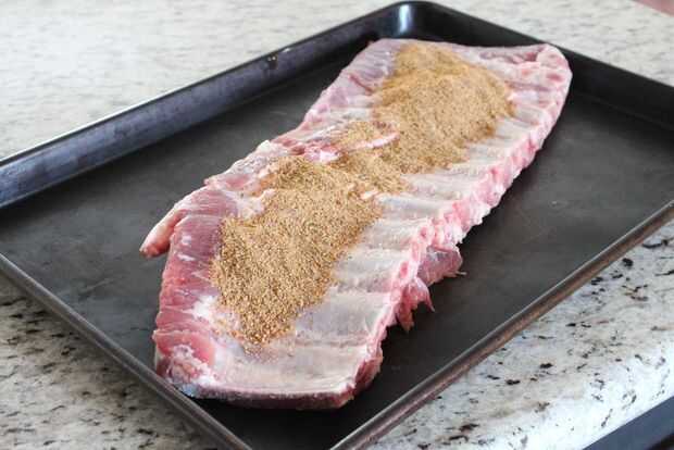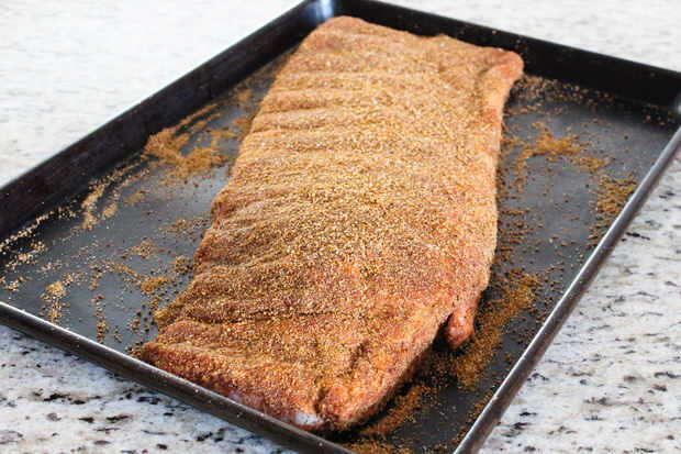 Retire todas las toallas de papel de la bandeja para hornear y colocar las costillas. Cubrir generosamente en el rub - utilizo el cuenco entero de frotar cada vez. :)