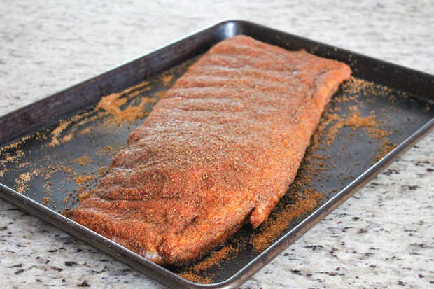 Retirar las costillas de la nevera y cepille todos el problema de exceso de la bandeja para hornear. (o transferirlos a una nueva!)