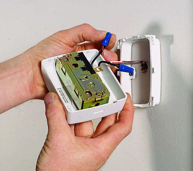 Ejecute el cable de baja tensión, dos hilos el humidificador en el armario del horno y el horno para el humidistato. El método de cableado exacto varía según el horno. Algunos sistemas tienen grifos de humidificador y algunos no. Si no ve un tablero de bornes con los golpecitos del humidificador con la etiqueta, usted necesitará de empalme en el cableado del ventilador según las instrucciones del fabricante. La unidad de potencia, instalar un transformador en el lado del horno y conecte los cables de baja tensión a los terminales externos dos. Acabado por cable que un humidistato en una habitación contigua y conecte los cables a los cables con conectores de torsión (Foto 9).