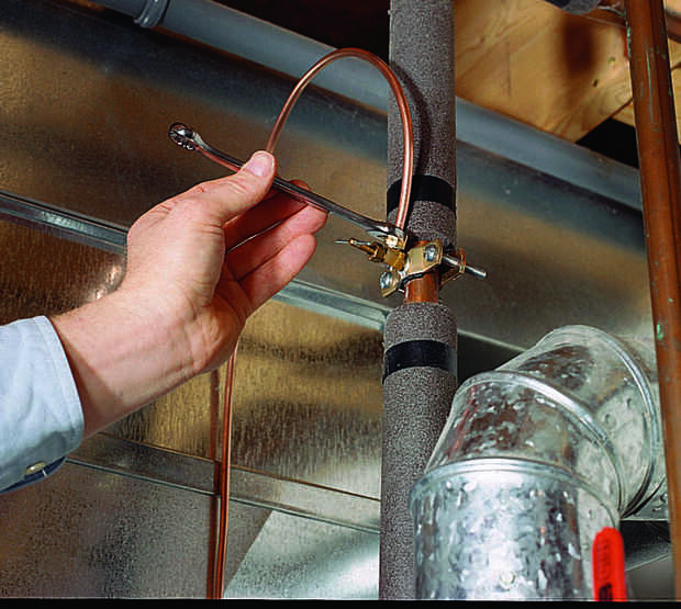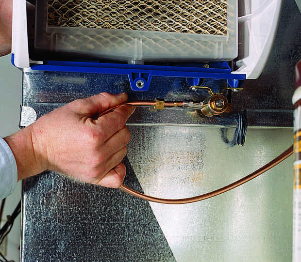 En cuanto a la conexión de agua, usted necesitará decidir si aprovechar el lado del sistema de agua caliente o frío. Agua caliente hace el humidificador cerca de 10 por ciento más eficiente, pero vuelca agua que pagó al calor. En cualquier caso, instalar un grifo de silla de montar en una tubería de agua cerca y correr 1/4-pulg cobre tubo entre el grifo y humidificador. Deslice una tuerca de compresión y las virolas de cada extremo y doblar el tubo para cumplir con las guarniciones. En el humidificador, capa de la virola con caño y enrosque la tuerca en la electroválvula de la unidad (foto 6). Realizar una conexión similar en el grifo de la silla de montar y apretar las tuercas (foto 7). Continuación, instale la tapa del humidificador (Foto 8).