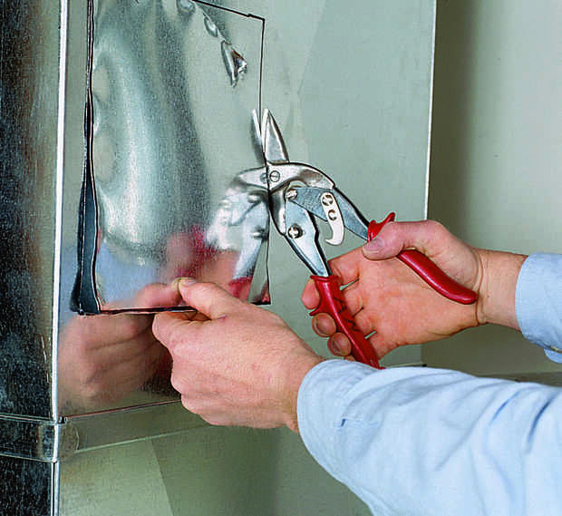 Utilice la plantilla de humidificador para marcar la abertura rectangular, hacer un agujero de arranque y corte la abertura con unas tijeras (Foto 1). Coloque la cubierta sobre la abertura, con las lengüetas de la parte inferior sobre el borde inferior de la abertura. Nivel de la cubierta y atornillar la chapa con tornillos (Foto 2).