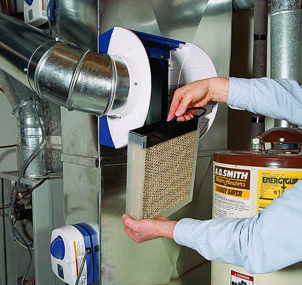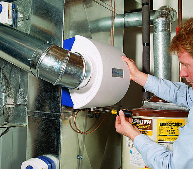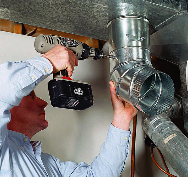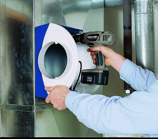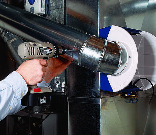 Luego, corte una abertura de 6 pulgadas en el lado de la oferta del conducto. Inserte un collar de 6 pulgadas y doble hacia abajo las lengüetas para trabarlo en su lugar. Si tu horno tiene aire acondicionado, el collar debe tener un deflector que se puede cerrar cada verano. Con el collar desconcertado en su lugar, instale un codo ajustable y apuntar hacia el humidificador (Foto 3). Ejecutar la pipa al humidificador, instalar un segundo codo y asegurar todas las uniones con tornillos (foto 4).