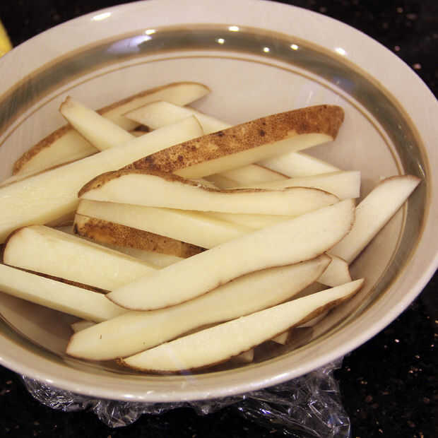 Lugar de papas fritas en un tazón y el abrigo plástico firmemente en.