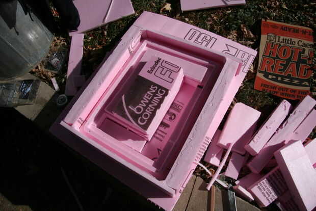 La tapa de la chimenea fue divertido de hacer. Que mide la cima irregular de la chimenea (niños, cuando usted construir la chimenea, no hacer como este) y las formas de aislamiento de poliestireno. Se puede ver que hay un surco de goteo que va alrededor de los bordes. La base de la tapa fue para acomodar la cima irregular ridículo de la chimenea.