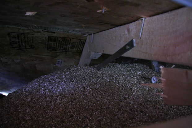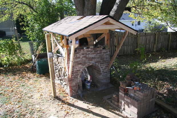 Cimentaron varias piezas de madera de 2 x 4 para la base del horno. Estos miembros verticales fueron reforzados con cruz piezas que formaron fuertes secciones triangulares. En este marco, he añadido vigas. En las vigas del techo, coloqué OSB, fieltro para techos y tejas de asfalto. Las vigas fueron triangulares con 6" de rizo en los lados. Por encima de la cúpula, no había suficiente espacio para permitir el aislamiento adecuado, así que hizo un travesaño metálico y utiliza una sierra reciprocante para quitar al miembro original de la madera. En el frente, hice el travesaño más corto y más alto para acomodar la cabeza de la cocinera. Si tuviera que hacerlo otra vez, haría que la echada de la azotea un poco más alta.