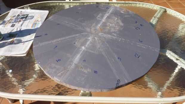 Puse a dos hojas y un clavo y una cuerda, dibuja un radio de 45cm, luego con una sierra de calar con una sierra para cortes limpios (una pequeña y delgada), corta las mitades del círculo, luego con golpe el pegamento
