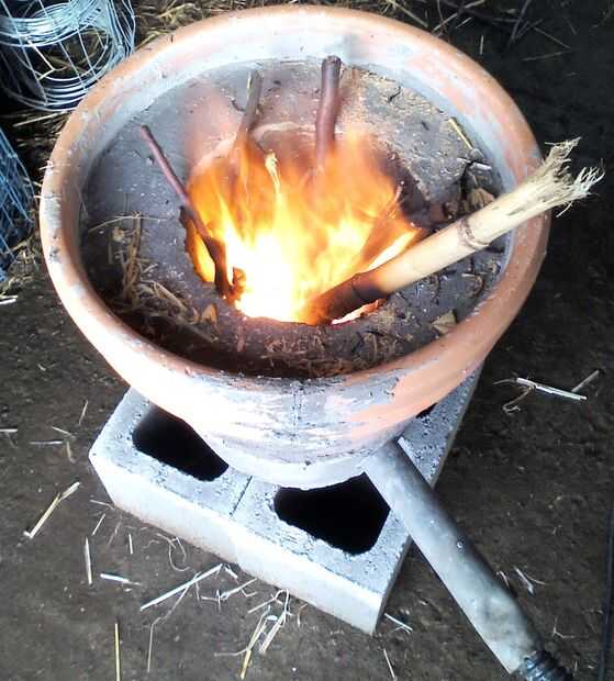 Luz el papel (usando un palo encendido, paja o una cerilla larga) y obtener el fuego que va. Deje que el fuego coger bien Inserte el tubo de aire en el orificio del tubo de aire y coloque el tubo de aire a un suministro de aire (por ejemplo, los gases de escape de su tienda de confianza-vacío). Empezar su vacío en lo más bajo posible para que no pongas el fuego hacia fuera.