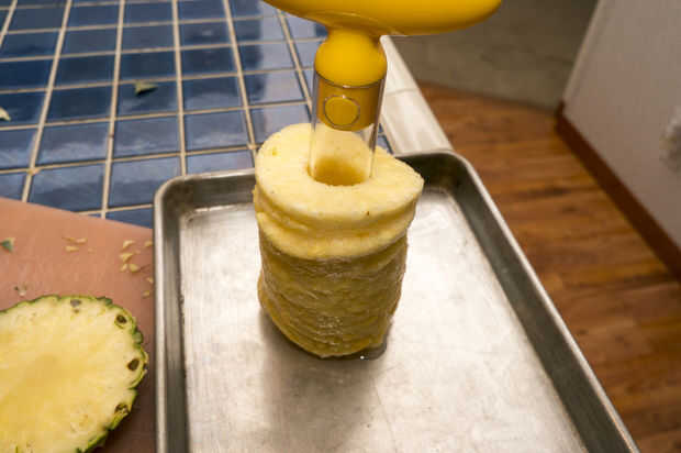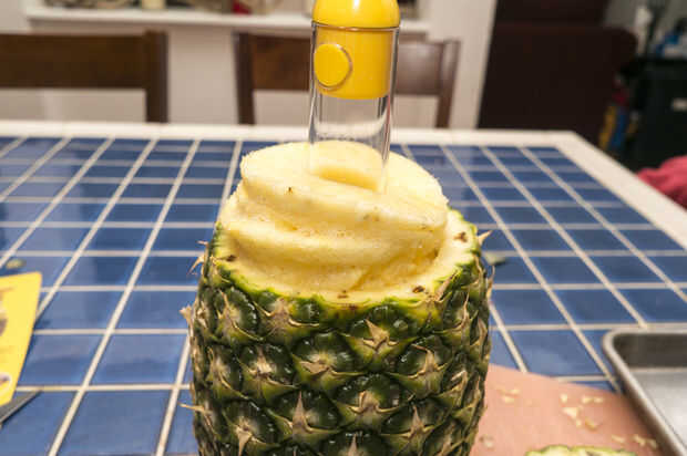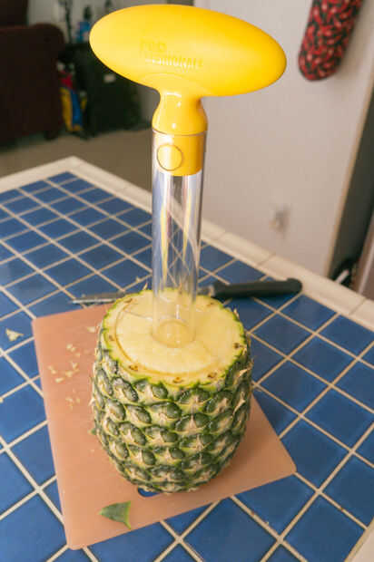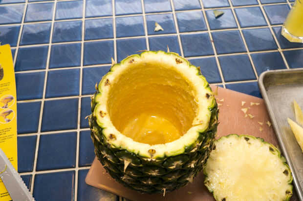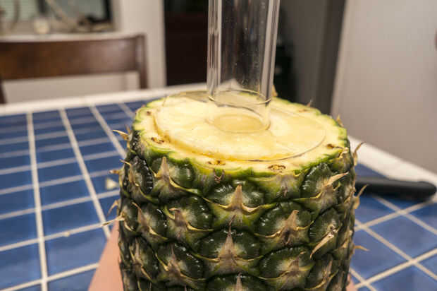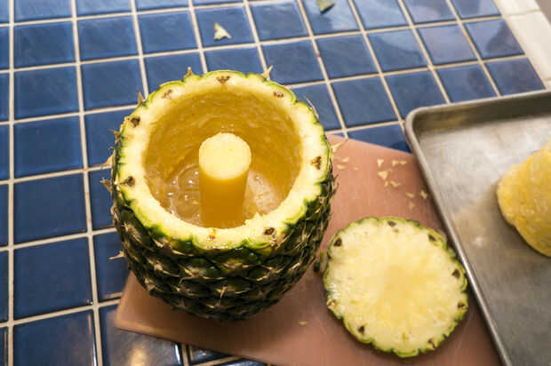 Cortar las piezas de hojas de la piña. Estos podrían se queman durante la cocción y olor desagradables. Cortar la parte superior como nivel como sea posible. Utilice la herramienta de base de piña para ahuecar la piña. Ponga la herramienta al lado de la piña para ver la profundidad tiene que ir sin ir a través de todo el camino. Haga una marca o poner un pequeño pedazo de cinta en la herramienta para saber donde parar. Es el mismo concepto como marca un poco una prensa del taladro. Obtener la herramienta de centrado para arriba y aplique presión mientras giro y esto deben cortar sin problemas. Al llegar a la profundidad deseada, luego tire la herramienta junto con la espiral de corte de piña. Guardar tesis para pasos posteriores. También beber el jugo, no hay mejor que eso.