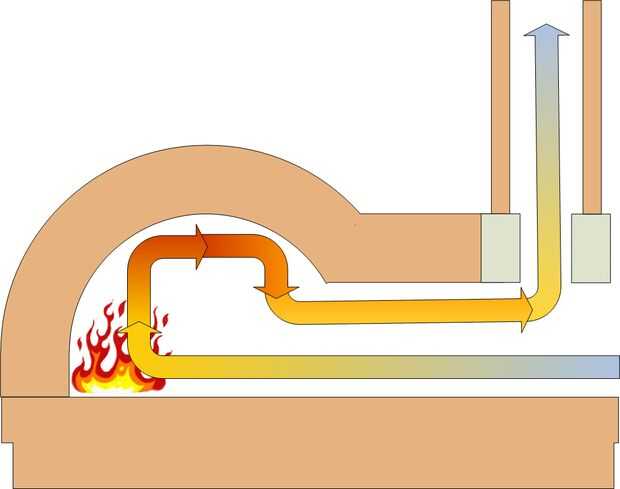 Este horno trabaja bajo el principio de convección: un fuego arde en la parte posterior del horno. Es alimentado por el aire frío que fluye en a lo largo de la mitad inferior de la cavidad. El aire caliente y el humo se levanta a lo alto de la cúpula y luego se dibuja hacia fuera a lo largo de la mitad superior de la cavidad a través de la chimenea. El aire caliente de la cúpula provoca calor irradiado hacia el suelo y cualquier pizza que puede encontrarse en su camino...