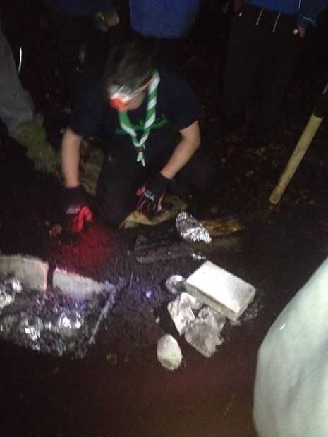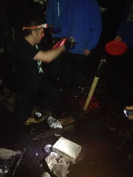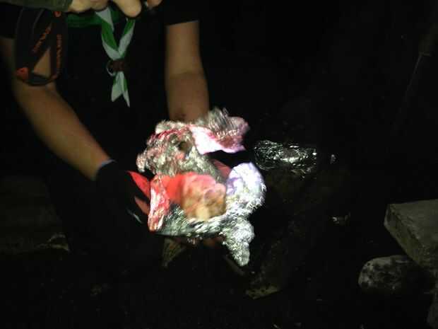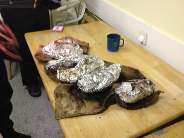 Cuando piensas en la comida es cocinada se puede desenterrar. Atención es necesaria para no perforar los paquetes de alimentos con la pala. Si coloca el saqueo en el paso 6, a raspar más lejos del suelo y, con un poco de ayuda, debe poder agarrar las esquinas y levante el saqueo y el suelo lejos.