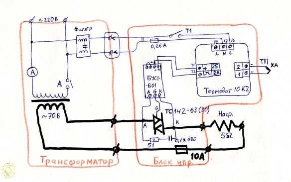 Te le informo sobre transformador más adelante. Ahora algunas palabras sobre la unidad de control. Se pondrá el interruptor T1, está protegido por fusible de 0, 25A. Hay un filtro incorporado de sobretensión en el transformador de la vivienda y está dirigido para proporcionar energía al controlador. Debe utilizar simistor TS142-80 (1420V, 80A, he firmado que en CHIP y DIP). Localicé el simistor en el radiador, pero como mi experiencia demostrada, no hay calor demasiado. Por favor no se olvide de hacer una simistor de aislamiento contra el de la vivienda. Usted debe usar mica o cerámica. Se debe aislar o simistor por separado, o - simistor montado con radiador.