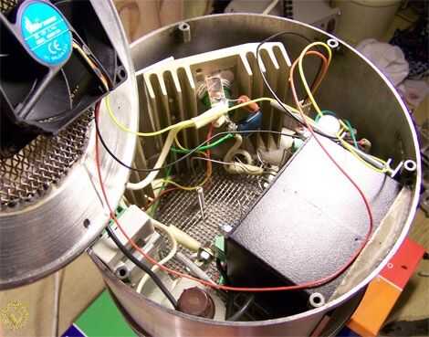 Se puede ver detrás de Thermodat hay unidad de control del ventilador situado. He añadido esta unidad de control para más adelante del ventilador y el ventilador sí mismo poner en malla inferior. Construcción de unidad de control es muy simple: transformador, puente y condensador. Salida es de 12V. El ventilador (cooler) que desmantelado desde ordenador.