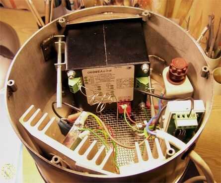 Unidad de control con control de temperatura Thermodat - 10K 2. En la esquina superior derecha – conmutador de energía se encuentra. Arriba a la izquierda, palanca de elevación del hervir con barra de base de la elevación (electrodo para acero d = 3mm).