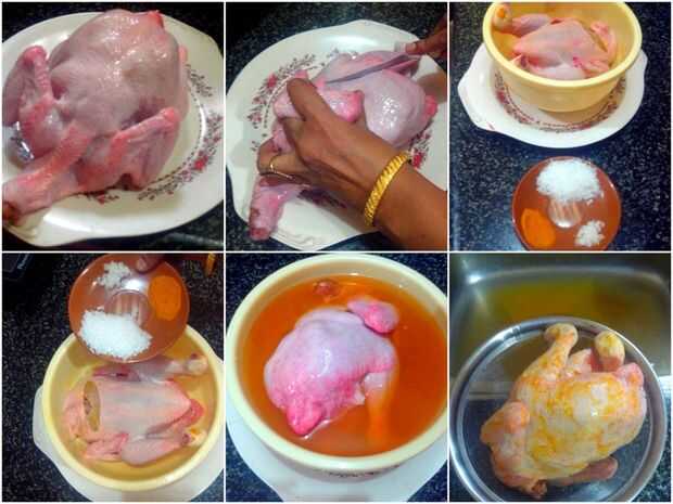 2. tomar el pollo en un tazón, agregar la cúrcuma, sal, pasta de ajo el jengibre y agregue bastante agua en él.
