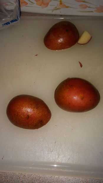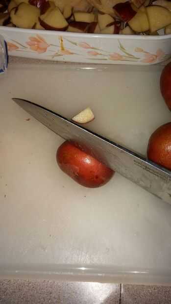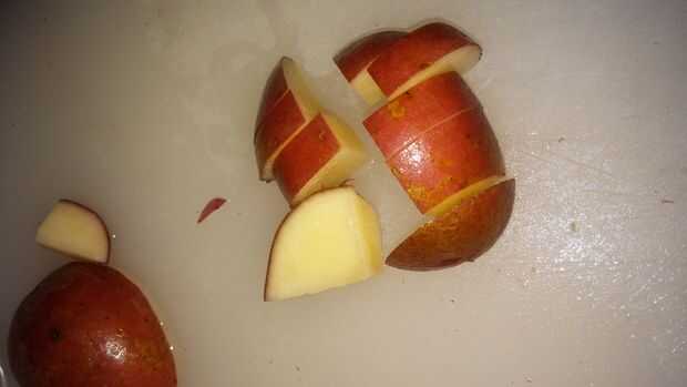 Lavar las papas y quitar y piezas que estén dañadas o bruto mirando. Luego cortar por la mitad y la mitad de esa mitad, luego corta sobre 6-8 trozos y añadir a la sartén con el pollo. Pre calentar el horno en este momento.