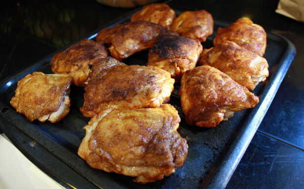 eso es correcto pollo "frito" en la parrilla. Saltar el aceite y lío y freír el pollo un verdadero placer.Lo que se necesita:6 muslos de pollo - en piel!HarinaSal de Chile JalapeñoRiley's todo propósito condimento (sin sal)Pimienta negraFrancos