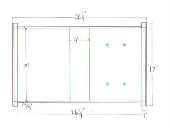 La trasera es de 17 "x 28,25". Cortar una tira de 3/4 "x 26,5" de cada lado con 1" en cada extremo. Cortar 1/4" en el lado para hacer una ficha de 1" x 1" en cada esquina para que 1/4" del borde puede ser doblada sobre.