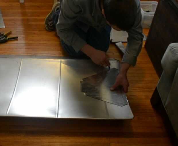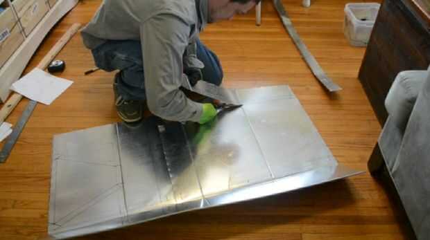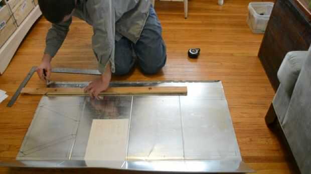 Diseño de las piezas en la hoja de metal según los dibujos. Diseño de la espalda grande panel primero, esto se puede dividir en dos piezas si está usando un pedazo más pequeño de lata. A continuación, el diseño de los laterales y estante de la ayuda. Una vez cortado el primer lado y utilizarlo para trazar el segundo lado.