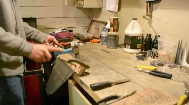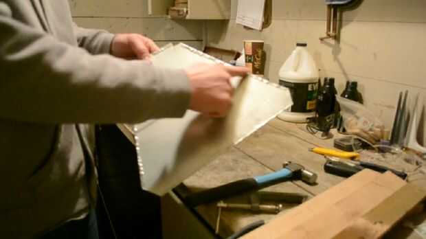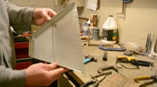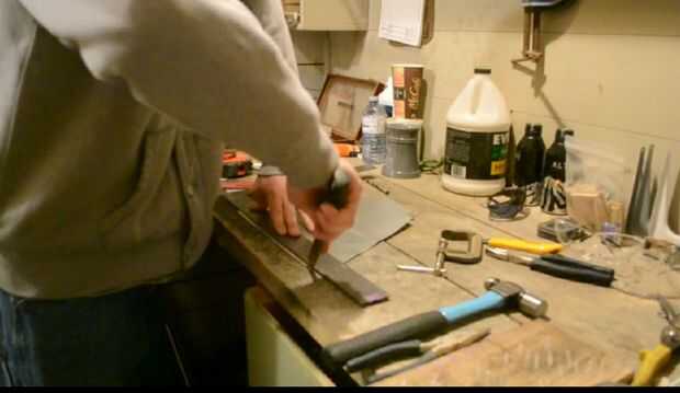 Para dar forma a la lata solía un cincel viejo Marque el exterior de una curva o doblez. Esto ayuda a mantener la curva siguiendo una línea recta y da mejores resultados. Una vez que una línea se describen a continuación, coloque algunos pedazos de desecho de la madera a lo largo de la línea en el lado bueno de la parte con algunas abrazaderas de tipo c. Usando un martillo comienzan a martillo de un lado a los otros y poco a poco trabajo a lo largo de la curva. No martillo completamente hacia abajo en una sola pasada ya que puede ocasionar la lata doblar, utilice unos pases. Una vez que la lata en una curva de 90 °, quite las abrazaderas y madera y continuar a martillo el borde trasero para completar el doblez de 180 °.
