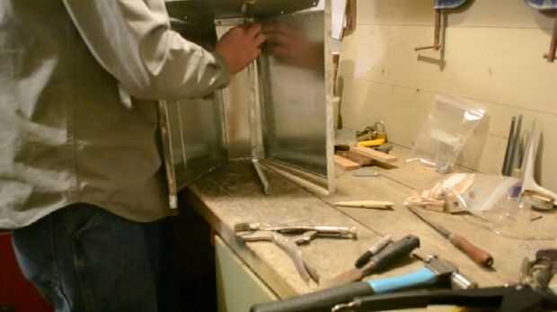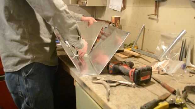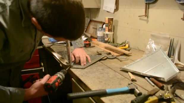 Alinee el soporte con el panel lateral, frente a uno de los agujeros traseros. Abrazadera junto con algunos apretones de tornillo de banco y taladro en la plataforma. Dejar de lado el soporte, alinee el panel lateral en la parte trasera y perforar los dos agujeros traseros. Utilice la pistola de remache a colocar el panel lateral y el panel trasero junto en el orificio superior. Alinee la bandeja dentro del horno con los orificios inferiores de la espalda y del remache de las tres piezas juntas. Asegúrese de que el estante no es boca abajo.
