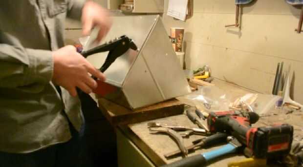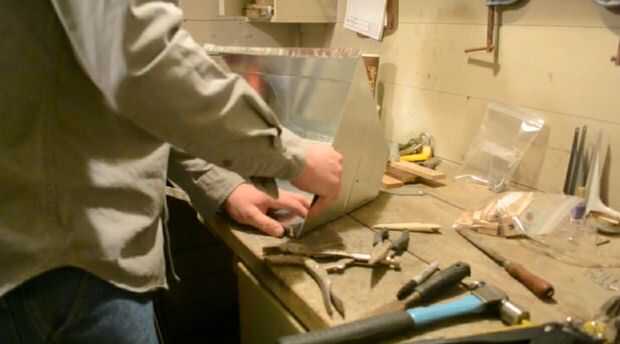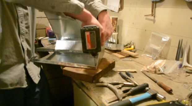 Al alinear el panel lateral con el borde de la parte trasera, doble la pestaña 1" en el panel posterior 90 ° así que puede meter dentro del horno. El borde del panel posterior con el lado de la línea, perfore el orificio delantero y remache los dos juntos. Continuar con los bordes restantes alrededor del lado. Una vez fijado el lado totalmente, alinee el estante y fijarlo con la abrazadera en posición con algunas pinzas de tornillo de banco. Perfore los dos agujeros a través del lado y remache el estante en su lugar. Repita con el otro lado.