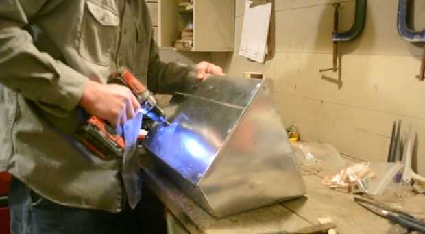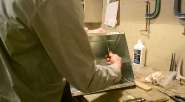 Martillo de los dos bordes delanteros de la parte trasera para que coincida con el ángulo de los paneles laterales. Una vez que coincide con perforar el panel lateral y la ficha 1" del panel posterior y remache de juntos. Repita con las otras esquinas.