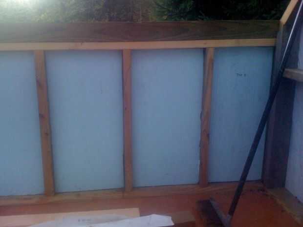 utilicé dos 2 clases de aislamiento en las paredes. Similar al piso, cortar rectángulos de espuma de poliestireno y colocado dentro de los montantes de la pared y contra el revestimiento exterior. A continuación, coloqué una capa de aislamiento de Reflectix burbuja warp alrededor de todo el interior del marco. Estaba tratando de crear un espacio de aire muerto entre la envoltura de espuma de poliestireno y burbuja. Las costuras del abrigo de burbuja selladas con cinta adhesiva con respaldo de aluminio y grapas en su lugar. Excesivo, excesiva, excesivos.