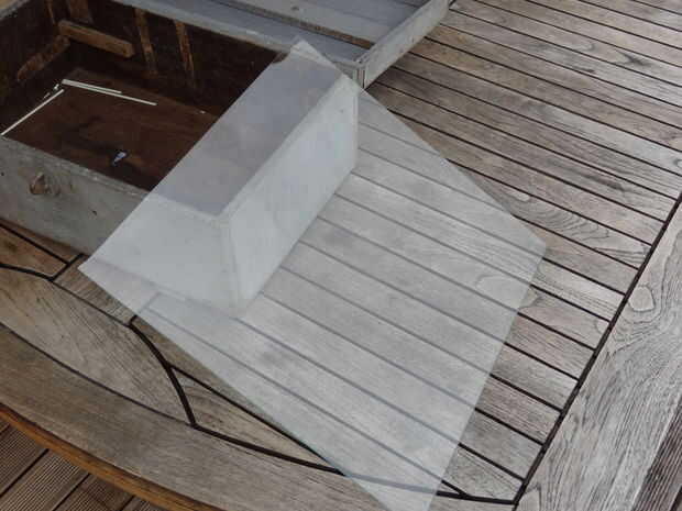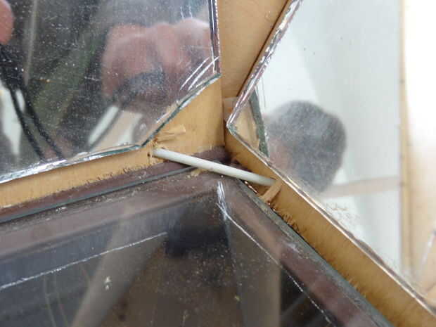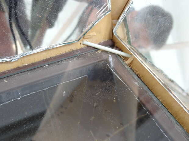En primer lugar, pegar la tira del sello alrededor de la parte superior de la caja. Cortar el cristal desde el marco de imagen con el tamaño correcto, el vidrio que usé era bastante fina (2,5 mm) pero funciona bien para mí. He intentado hacer algunos doble acristalamiento pero no resultan muy bien... Voy a probar alguna otra vez. Para fijar el vidrio a la caja no utilizo cualquier bisagras, acababa de usar pasadores en las cuatro esquinas.
