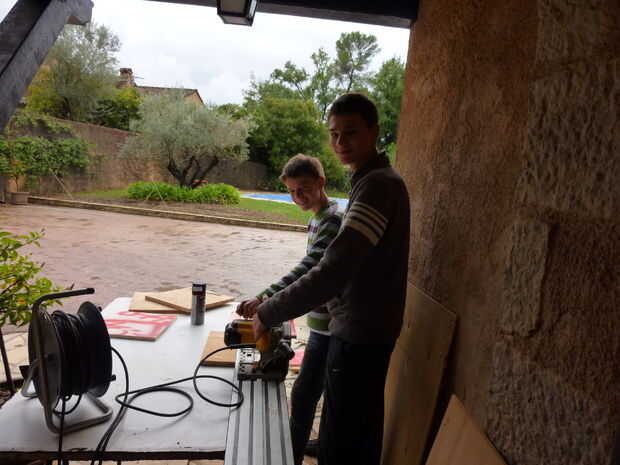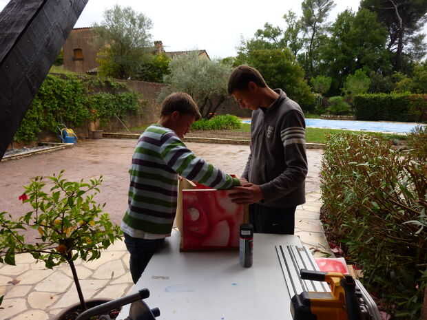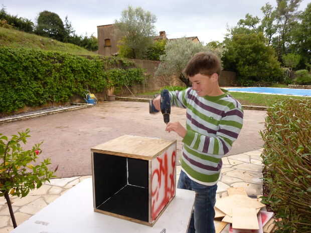 Este paso es simple, haces la caja según las dimensiones que usted eligió. I mina había hecha de madera contrachapada de 18 mm espesor y había ensamblada con tornillos y sellar las juntas con la masilla de silicona para permitir fugas de aire tan poco como sea posible. Ahora, en las fotos ver que los tablones de madera fueron pintados con pintura en aerosol negro alta termerature pero más adelante se verá que esto era de ninguna utilidad después una modificación fue hecha dentro de la caja (véase los pasos finales)