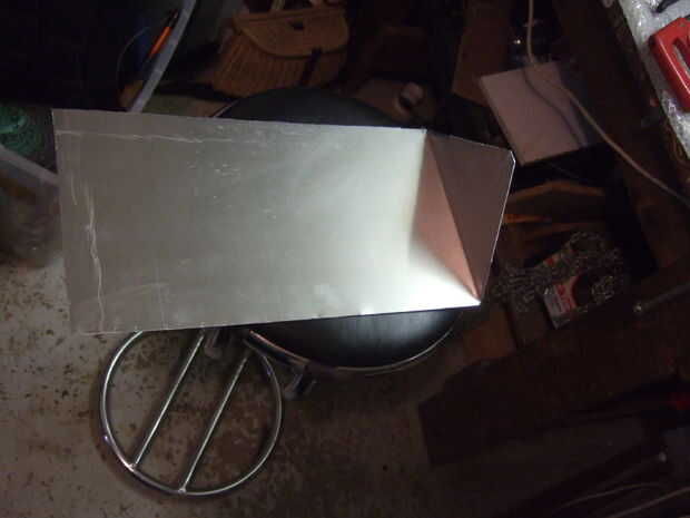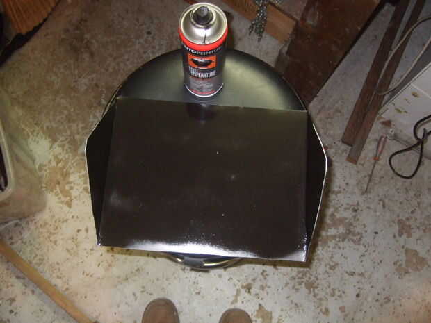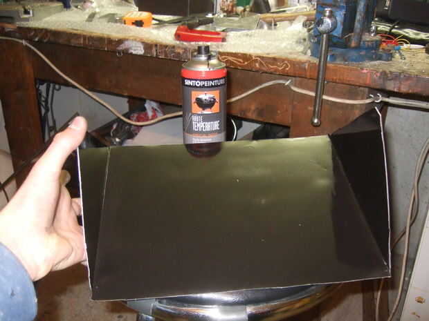 Esta placa es muy importante porque le permite mantener el nivel de comida cuando incline el horno hacia el sol. Fue cortado de alguna chapa de aluminio con una sierra de calar, luego fue pintado de negro y atornillada en su lugar dentro de la caja usando arandelas para permitir que la bandeja gire.