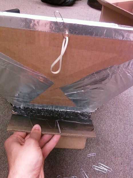 Después de que la pintura esté seca, forme algunos clips para sostener todo junto. Agarra tus gomas y clips de papel y unirlos en un segmento de banda-clip Clip de caucho. Dependiendo del tamaño del horno, puede que necesite uno, dos o tres clips por cada lado. A continuación, mostramos un ejemplo de uno y dos clips por tamaño. En la cámara de cocción, empuje un extremo del clip a través de la cartulina para anclarla. Colocar el reflector en la cámara de cocción y estirar el caucho y para el otro clip en el borde del reflector. Repita para todos los lados.