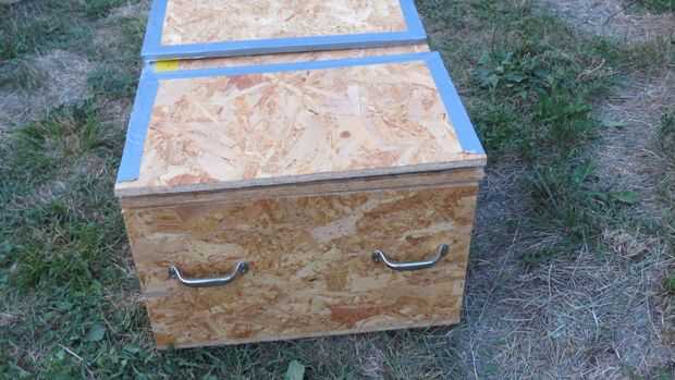 Una caja de espuma de poliestireno no será muy firme, por lo tanto, es aconsejable construir una caja alrededor de él. Para éste utilicé planchas de OSB que quedaron de la construcción de una choza (no idea lo que estas placas se llaman en inglés. De todos modos, sólo algún tipo de 'madera' barato, este material es realmente muy resistente al agua) para construir una bonita caja firme alrededor de él. Yo incluso le dio unos mangos en el lado que salió un viejo armario de la cocina para hacer más fácil mover todo. Es siempre en el césped pero si no es usted también podrían considerar la adición de ruedas.