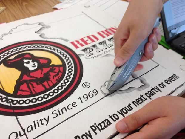 Utilice un cúter para cortar alrededor de las líneas que hiciste en el paso uno. No cortar todo el camino alrededor, dejar sin cortar la línea de la espalda. La aleta debe abrir el mismo que la caja de la pizza.