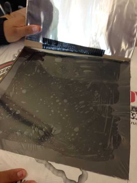 hice este horno solar de la nada, pero:una caja de zapatos (con la tapa puesta, no removavel),una camisa de invierno vieja,una bolsa de plástico,papel negro,dos lápices,y papel de aluminio.Paso 1: la tapa Corte la tapa como la imagen.Paso 2: el "cris
