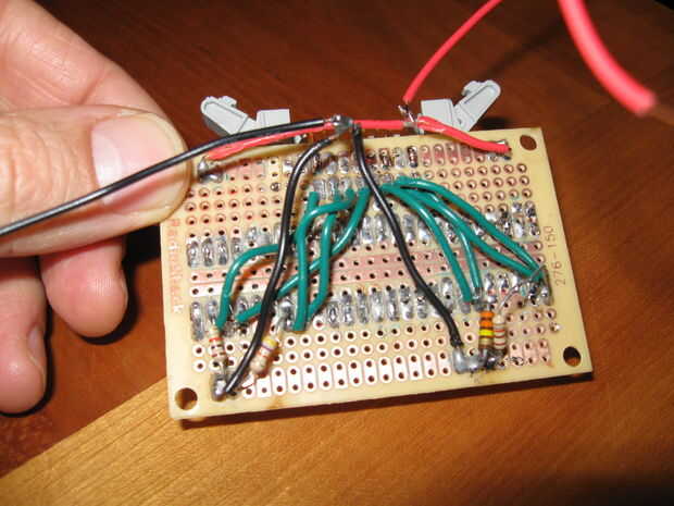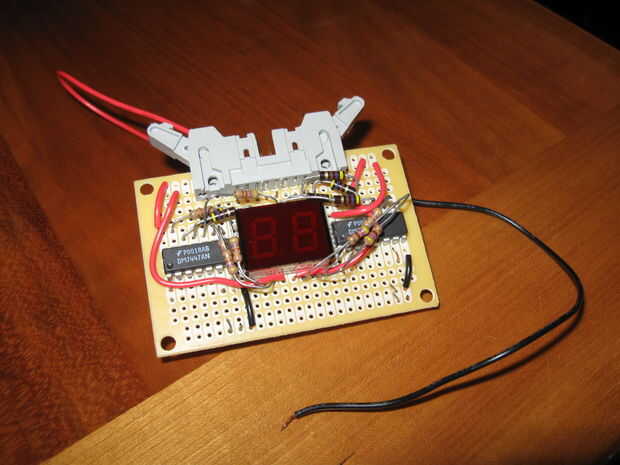 El display de 7 segmentos de 2 dígitos es un 482EC LTD y es conducido por dos pilotos de DM7447 ICs. Cada IC tiene cuatro entradas de Arduino (digital 0-3 para los dígitos de los pernos y pernos de 4-7 para las decenas dígitos). Entonces, cada IC tiene siete resistencias soldadas a él y a un pin en el chip de la pantalla.