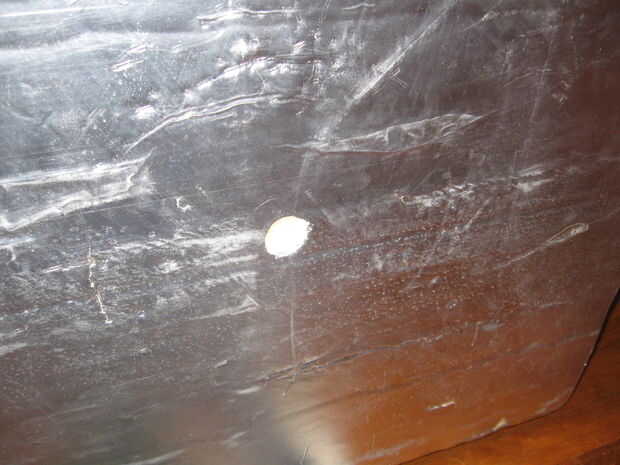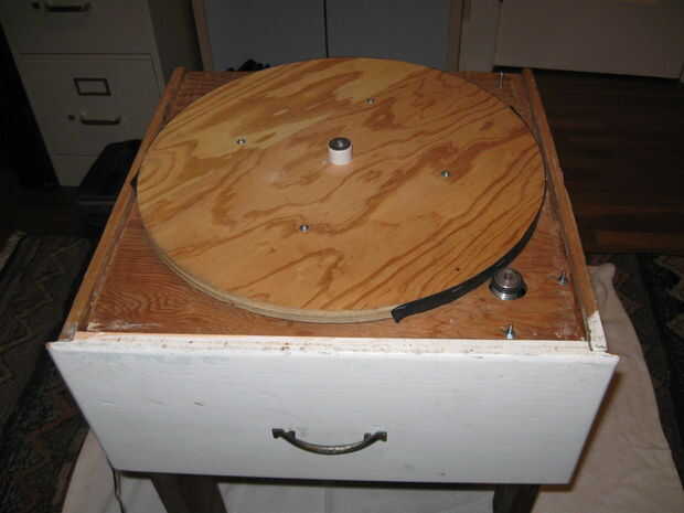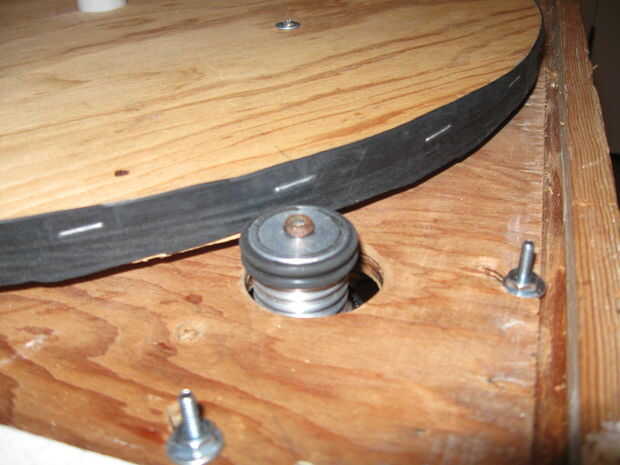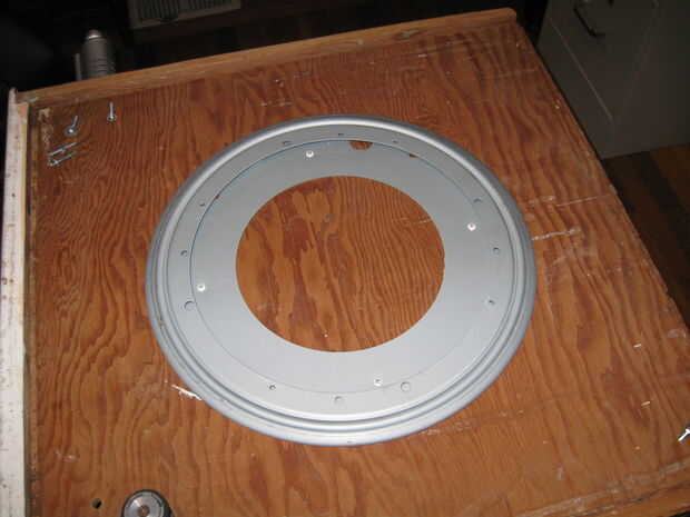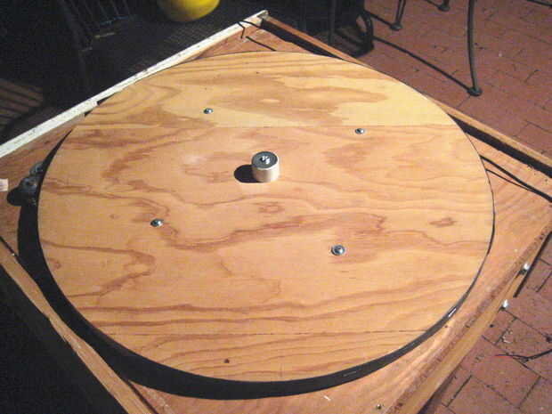 2. continuar con las instrucciones de Lazy Susan para montar el 18" círculo de madera concéntrico con la parte superior de la bandeja giratoria. Para la madera concéntrico, midió la distancia al borde del cojinete con una regla y trasladar las cosas poco a poco hasta que fue bastante bien. Utilicé tornillos de chapa corta que pasen por la madera y sujetar a los agujeros de montaje en el rodamiento. Si estos tornillos están incluso un poco demasiado largos, raspa contra la superficie fija del rodamiento y evitar girar suavemente.