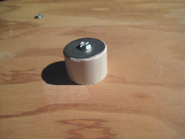 3. cortar un trozo de tubo de PVC de diámetro de 1 pulgada en una longitud de 1 pulgada. Este tornillo en el centro de la plataforma giratoria, con una arandela guardabarros de 1 pulgada entre el tornillo y la sección de la tubería. Este cilindro que sobresale se utilizará para el horno solar en la plataforma del centro.
