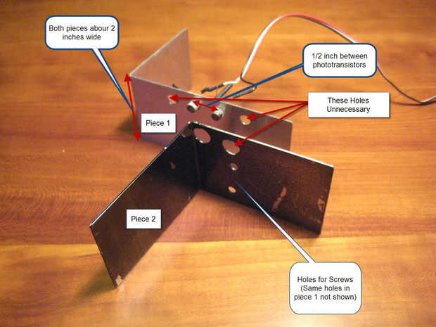 1. Haga dos orificios en la pieza 1 del tamaño de los fototransistores, 1/2 pulgada aparte, como se muestra en la primera foto.