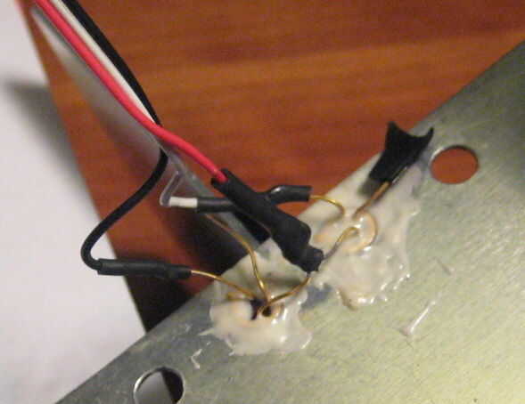 7. una vez seco el epoxy, soldar los cables al cable de 3 conductores como se muestra. en mi circuito de los colectores de ambos transistores conectan el cable rojo, mientras que cada emisor se conecta a un cable separado.