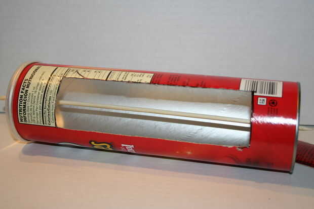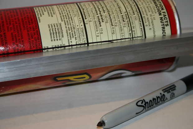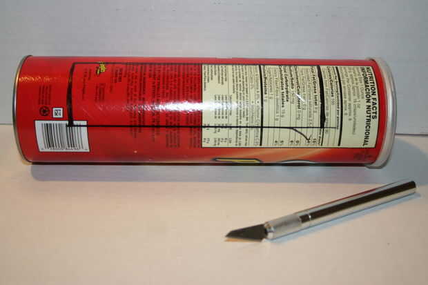 Con la regla (u algo con borde recto de las Naciones Unidas) dibuje un rectángulo en la superficie de la lata. Elegimos este lado porque ya tuvo líneas.