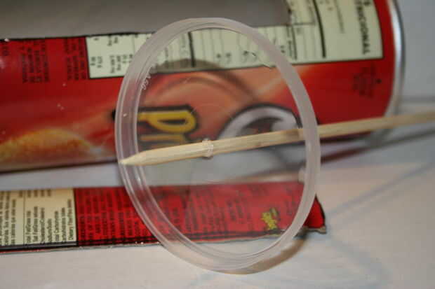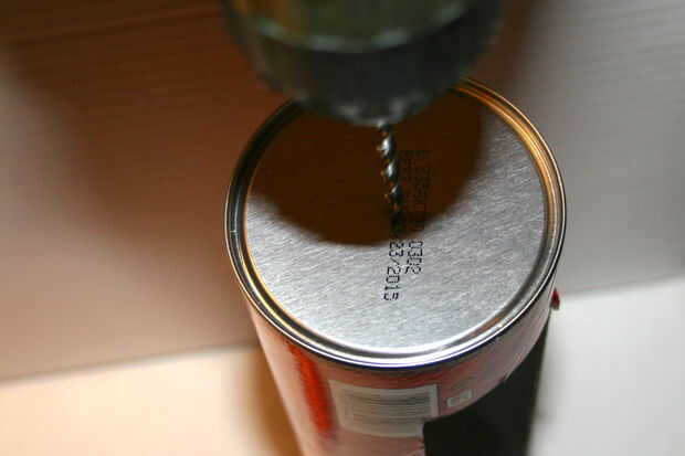 Retira la brocheta y ponga la tapa en el fondo de la lata. Marque el agujero con el marcador y usar el taladro para hacer un agujero esté alineado con el de la tapa.