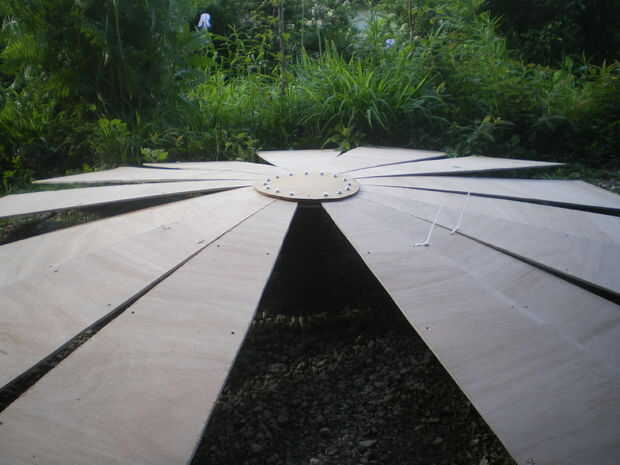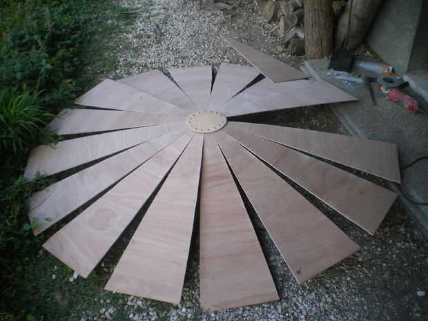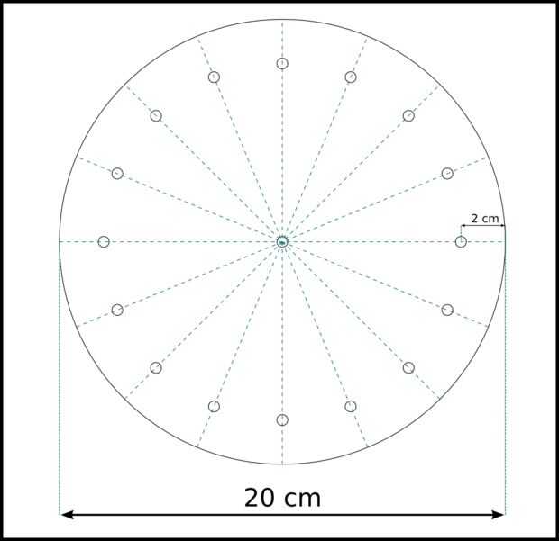 Corte dos discos de 20 cm de contrachapado. Dividir como un pastel en 16 partes iguales y taladre orificios de 2 cm desde el exterior de los discos.