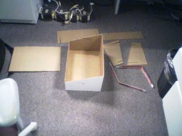 Por encima puede ver todos las piezas precortadas para formar la cocina principal del compartimiento. Corte la caja en un ángulo de 20 grados para permitir la máxima exposición al sol. En mi latitud, la elevación más baja que el sol se pone es 26 grados sobre el horizonte sur.