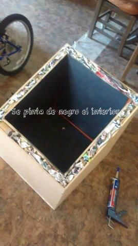 Antes de asentar la caja pequeña "horno" dentro de la grande, se debe colocar pedaceria de cartón o papel periódico de cumplir para formar una capa aislante en el fondo, lo mismo se debe hacer para los costados.