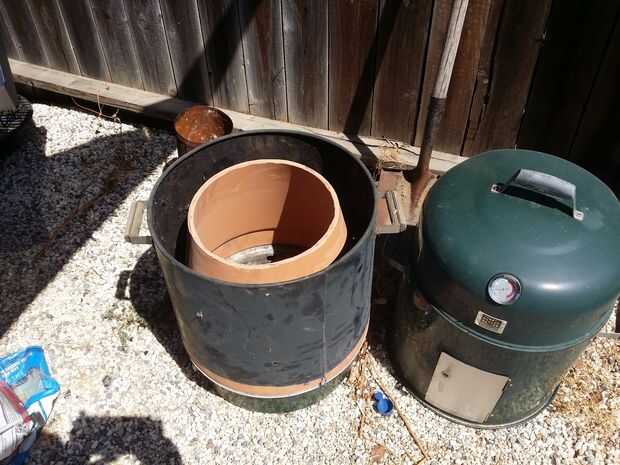 Este es más complicado. Tienes que hacer matemáticas. Tome todo el hardware del fumador. Era capaz de dejar las asas, pero todo lo demás tenía que salir. Corte la parte inferior del fumador barril con una sierra para metales o lo que sea. Me mide por lo que sería aproximadamente una pulgada por encima del borde de arcilla cuando haya terminado. Eso significa seis pulgadas.