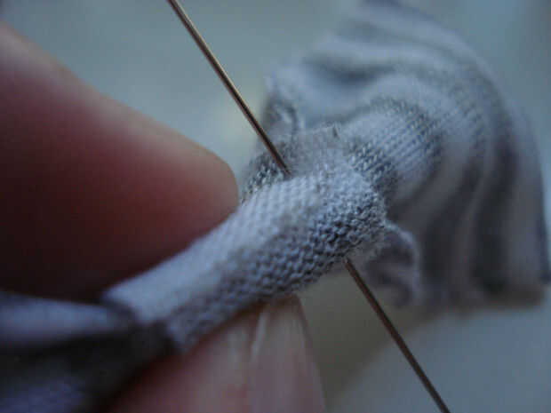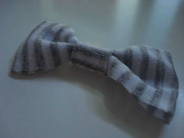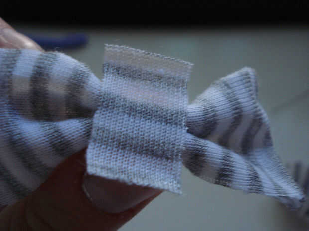 Doblar las dos aletas hacia el borde posterior, como cuando estaban viendo como se vería en el paso 4. Sostenerlo con los dedos, o utilizar un pin si es más fácil. Tomar a la tela para la pieza media y mantenga un borde en la parte posterior del arco. Prender que si es más fácil para usted. (Recuerde, muchos alfileres por todo el lugar puede hacer cosas sucias, así que tenga cuidado con ellos!) Luego enrolle la pieza central alrededor de la parte delantera del arco y en la parte posterior. Ya sabes cuánto debe ser la pieza central. Cortado a la medida, dejando un pequeño margen. Mantenerla o pin en su lugar. Coser la media pieza en su lugar.