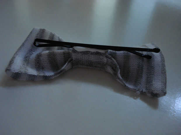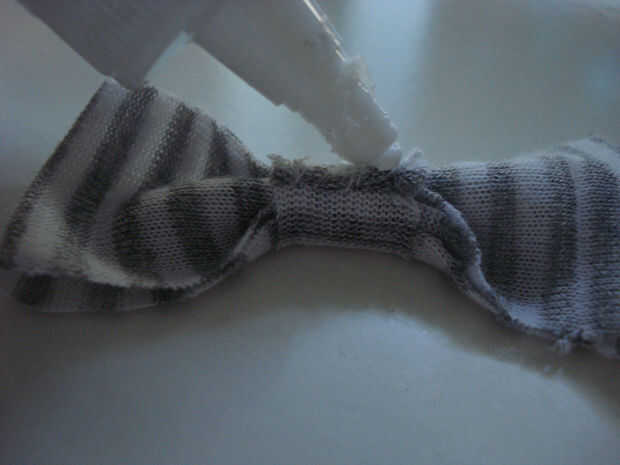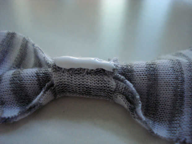 Hacia el arco en frente de él y agregue el pegamento a la costura posterior de la pieza intermedia que usted sólo cosido en el paso anterior. No necesitas poner pegamento en la parte del arco real (a menos que tal vez tu arco es grande o pesado). No necesita un montón de pegamento, pero uso bastante para que el arco no caiga el perno.